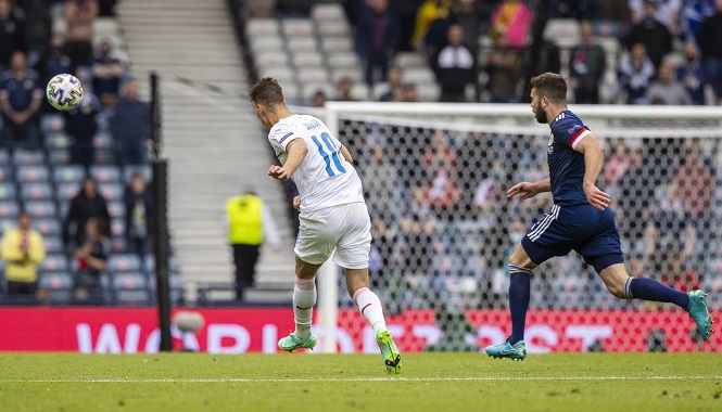 Trước trận đấu với Cộng hòa Séc, hậu vệ Kieran Tierney bất ngờ bị loại khỏi danh sách 23 cầu thủ Scotland thi đấu trận mở màn. Được thi đấu trên sân nhà Hampden Park, thầy trò HLV Steve Clarke nhập cuộc chủ động, liên tục gây sức ép với Séc. Tuy nhiên, đội khách mới là những người có cơ hội nguy hiểm đầu tiên từ tình huống dứt điểm nhanh của Schick ở phút 16.