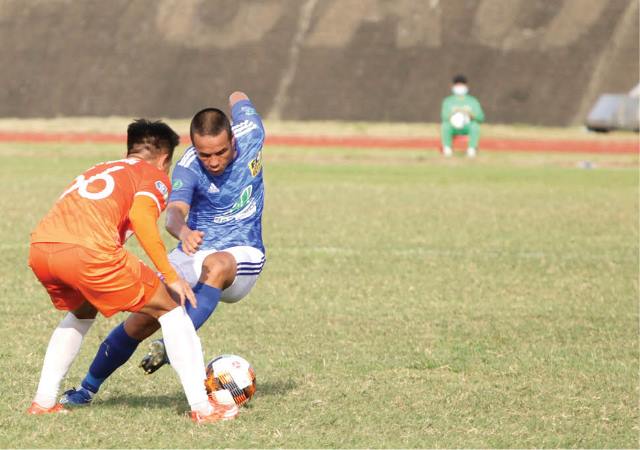 Một pha đi bóng kỹ thuật của Phi Pha (áo xanh) trước cầu thủ SHB Đà Nẵng tại cúp quốc gia