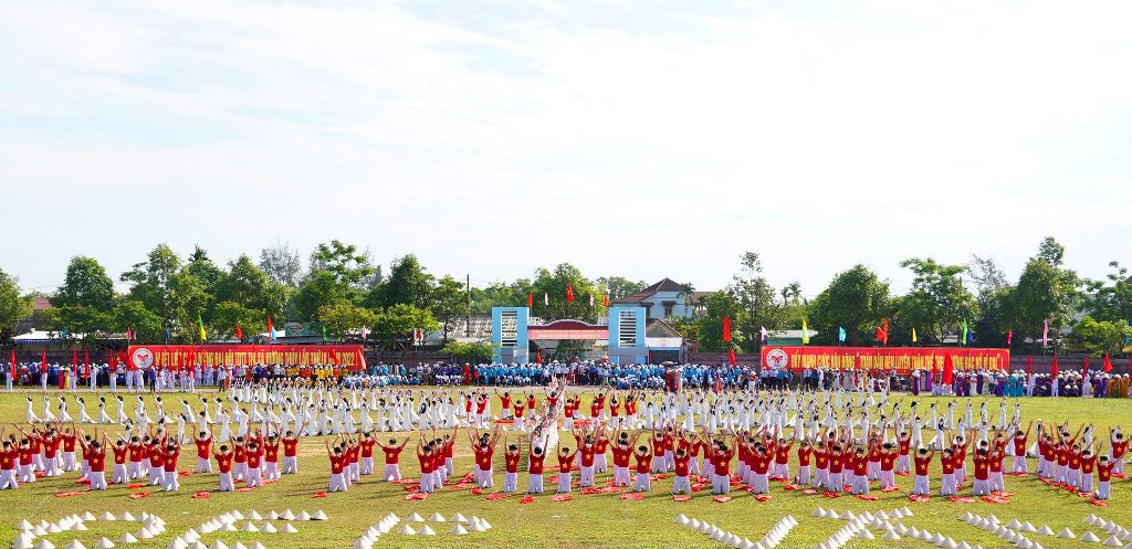 Sau phần biểu dương sức mạnh của gần 5.000 người đến từ 10 xã, phường và 24 đơn vị, cơ quan, trường học, lễ khai mạc tiếp tục tạo ấn tượng qua phần đồng diễn có chủ đề: “Chung tay xây dựng Hương Thủy giàu đẹp, văn minh”.