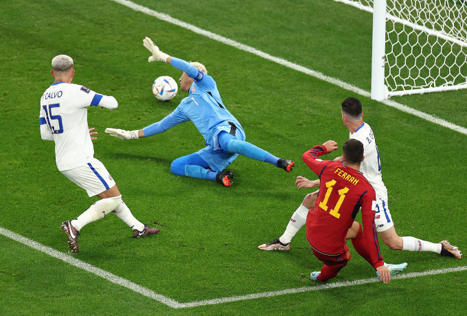 Torres (số 11, Tây Ban Nha) dứt điểm ở cự ly gần hạ gục thủ môn Keylor Navas ( Costa Rica). Ảnh: Reuters