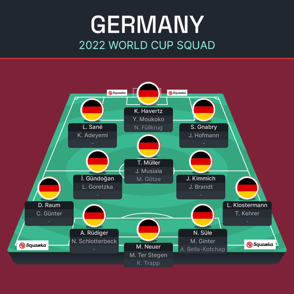 Đội hình Đức đến Qatar năm nay vẫn rất mạnh. Trong khung gỗ vẫn là Manuel Neuer dù đã 36 tuổi. Nổi bật nhất trong số các trung vệ là Antonio Rudiger, thủ lĩnh khi Mats Hummels vắng mặt. Ở vị trí hậu vệ cánh, 2 cái tên còn khá xa lạ là David Raum và Lukas Klostermann. Ilkay Gundogan và Joshua Kimmich là cặp đôi tiền vệ trung tâm tốt nhất. Ở vị trí hộ công, Thomas Muller có thể được đá chính nhờ kinh nghiệm trận mạc. Serge Gnabry và Leroy Sane là hai cầu thủ chạy cánh hàng đầu. Còn Kai Havertz là niềm hy vọng ở vị trí tiền đạo.