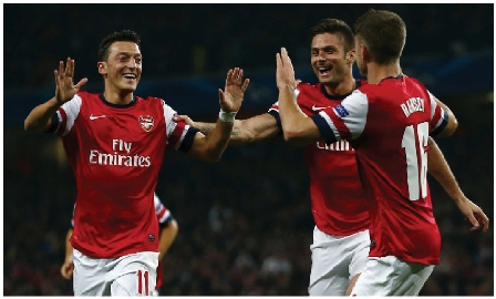 Ozil (trái) ăn mừng chiến thắng cùng đồng đội trong màu áo Arsenal. Ảnh: Internet