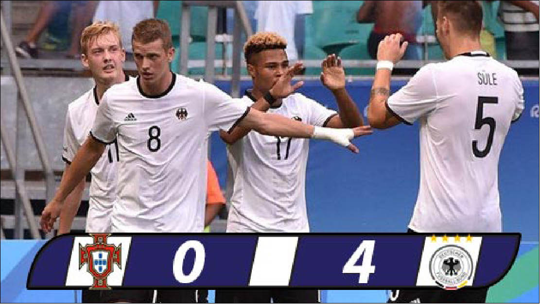 HNN - Sau khi thi đấu trầy trật ở vòng đấu bảng môn bóng đá nam, Olympic Đức đã trở lại chính mình khi đè bẹp Olympic Bồ Đào Nha với tỉ số 4 – 0 ở trận tứ kết. Qua đó trở thành ứng cử viên sáng giá cho tấm huy chương vàng môn bóng đá nam Olympic Rio 2016.