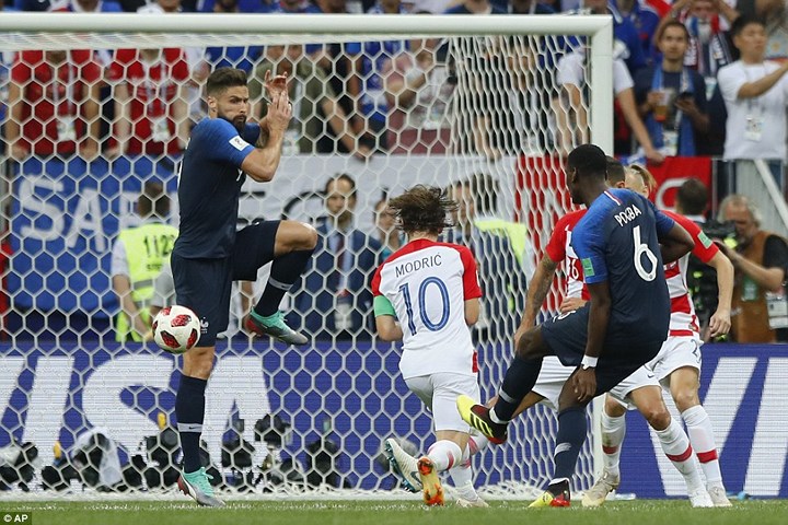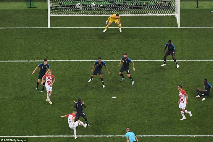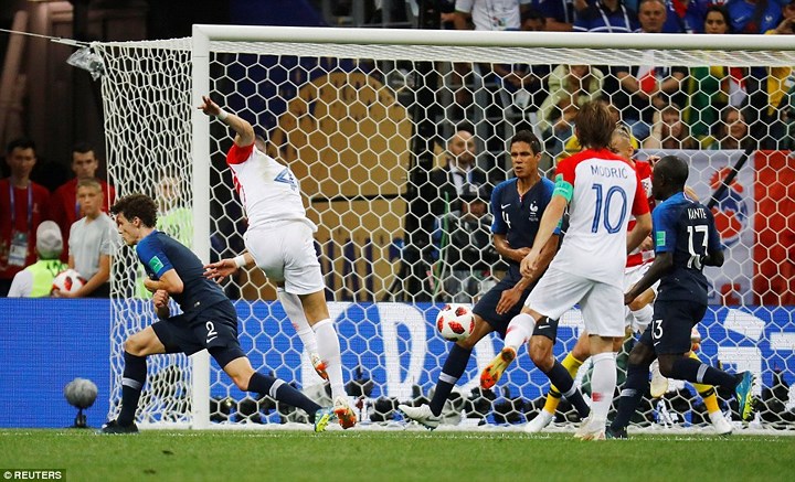 Xuất phát từ pha đá phạt trực tiếp của Antoine Griezmann, Mario Mandzukic trong nỗ lực cứu bóng đã đánh đầu về lưới nhà. Ảnh: Reuters
