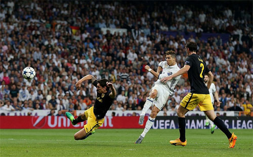 Chưa dừng lại ở cú đúp, Ronaldo tiếp tục cho thấy kỹ năng dứt điểm hiệu quả khi hiệp hai còn chừng bốn phút đá chính. Lần này ngôi sao người Bồ Đào Nha bình tĩnh chỉnh bóng sau đường chuyền dọn cỗ của Lucas Vazquez, trước khi tung cú sút chìm xuyên qua khe hẹp giữa Oblak và một hậu vệ Atletico.