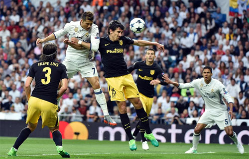 Hàng thủ Atletico bất lực trước pha bật cao dứt điểm của Ronaldo.