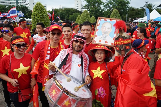 CĐV Việt Nam mang theo ảnh Bác để khích lệ tinh thần cho đội tuyển Việt Nam. Ảnh: Lâm Trần