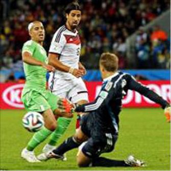 Ít người có thể nghĩ đến một Algeria lại có thể chơi thăng hoa đến thế khi thi đấu với Đức. Algeria với lối chơi nhanh, áp sát đã không cho “cỗ xe tăng” có nhiều khoảng trống. Chính đội bóng châu Phi mới là đội có những cơ hội rõ ràng trước, nhưng tiếc là đã không dứt điểm thành công. ĐT Đức chỉ dần lấy lại thế trận vào cuối hiệp 1, nhưng không thể nào tìm được đường vào khung thành trước hàng thủ chơi tập trung của đối thủ. Hiệp 1 không bàn thắng. Bước sang hiệp 2, Algeria càng chủ động chơi phòng ngự. Kết thúc thời gian thi đấu chính thức, hai đội không thể ghi bàn thắng và buộc phải đá thêm hiệp phụ. Ngay phút thứ 92, Schurrle có pha dứt điểm nhạy cảm mở tỉ số trận đấu. Sau đó Algeria buộc phải dồn lên và hở sườn để rồi phút 119 Ozil dứt điểm căng ở cự ly gần nâng tỉ số lên 2-0. Phải đến phút 121, Algeria mới có bàn danh dự do công của Abdelmoumene Djabou. Algeria phải sớm từ giã cuộc chơi.