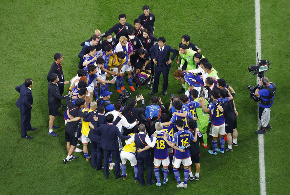 HLV Moriyasu và các cầu thủ đội tuyển Nhật Bản sau chiến thắng lịch sử trước Tây Ban Nha - Ảnh: REUTERS