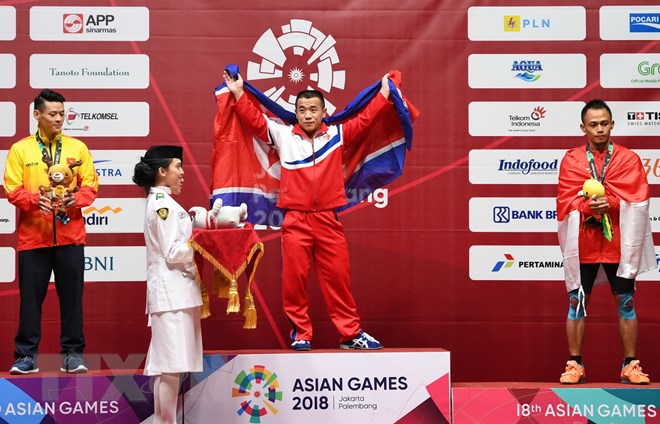 Vận động viên Việt Nam Thạch Kim Tuấn (trái) giành huy chương bạc, Om Yun Chol (giữa) của Triều Tiên giành huy chương vàng và Surahmat Bin Suwoto Wijoyo của Indonesia giành huy chương đồng nội dung cử tạ hạng 56kg. Nguồn: AFP/ TTXVN