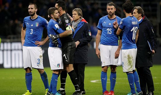 Sự thất vọng của các cầu thủ Italia sau trận play-off với Thụy Điển. Ảnh: Reuters