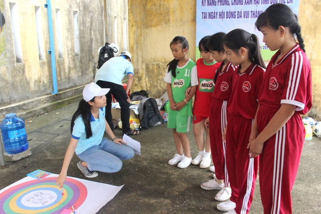 Võ Thị Nhã Phương, học sinh lớp 4/4, Trường tiểu học Tây Lộc chia sẻ: “Hôm nay được tham dự chương trình này em rất vui. Bên cạnh được chơi bóng đá, em được các thầy cô hướng dẫn các kiến thức về các quyền, vấn đề giới tính, sức khỏe, bạo lực gia đình,… Đây là những bài học rất bổ ích”.