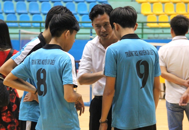 Hội ý tại giờ nghỉ giữa hiệp tại trận chung kết đội 3 nam cấp THCS