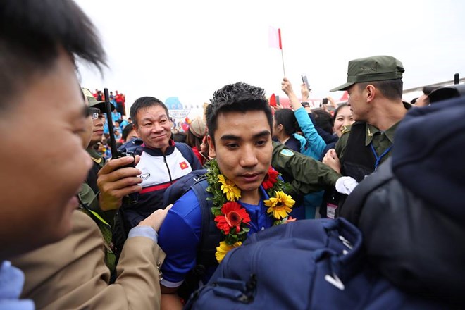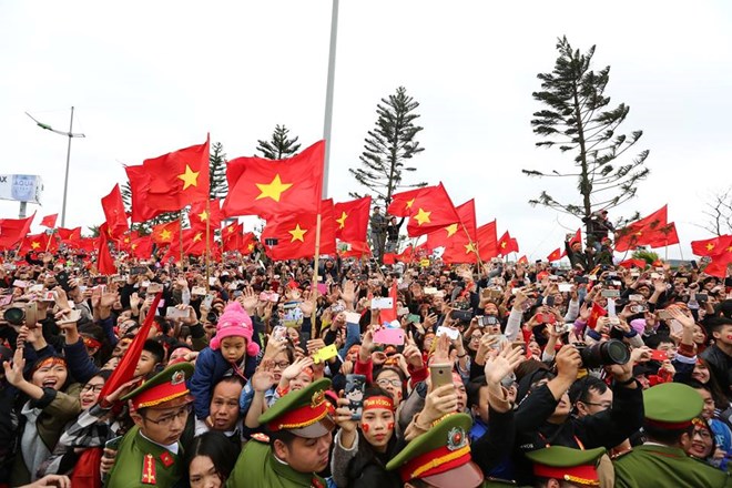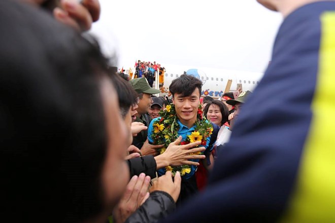 Thủ thành Bùi Tiến Dũng trong biển người hâm mộ. (Ảnh: Minh Sơn/Vietnam+)