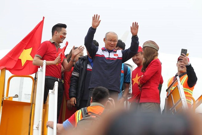 Huấn luyện viên Park Hang Seo xuất hiện ở đầu cầu thang máy bay. (Ảnh: Minh Sơn/Vietnam+)