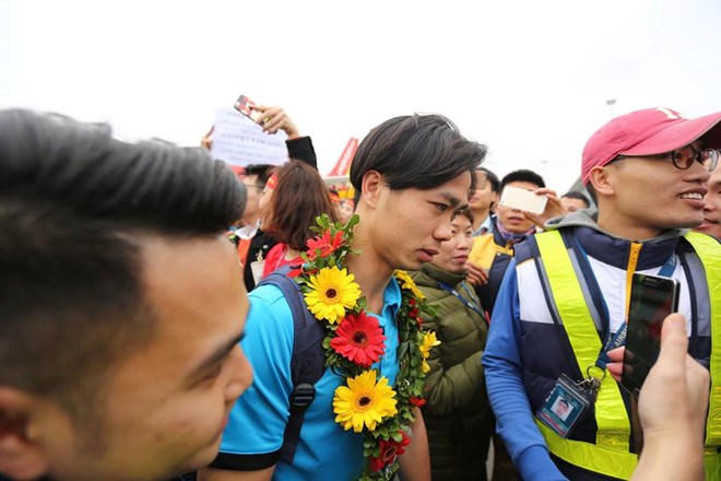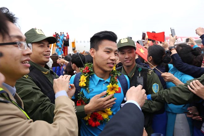 Vào hồi 13 giờ 05, chuyến chuyên cơ chở đội tuyển U23 Việt Nam từ Trung Quốc đã hạ cánh xuống sân bay Nội Bài trong niềm hân hoan của người hâm mộ.