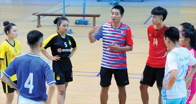 HLV Nguyễn Văn Hiền (áo sọc ngang) hướng dẫn kỹ chiến thuật cho các VĐV tuyển đá cầu Huế