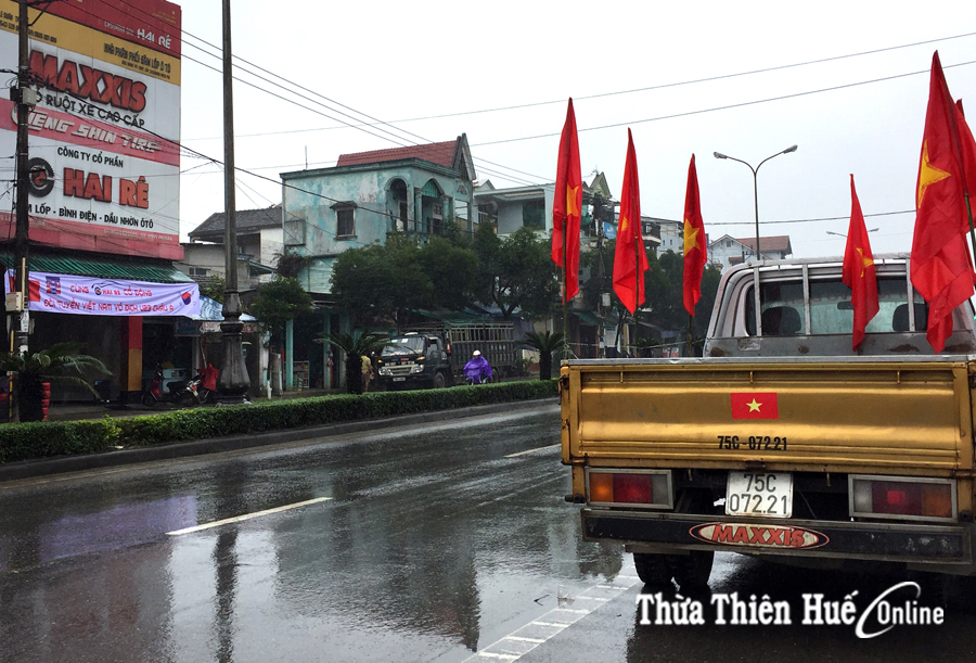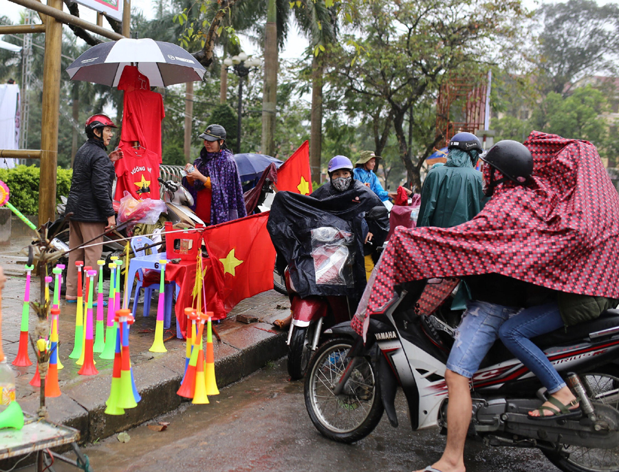 Sáng 27/1, người dân Huế vẫn “đội” mưa để “sắm” cho mình những lá quốc lý, áo cờ đỏ sao vàng, băng đô đeo đầu cổ vũ...