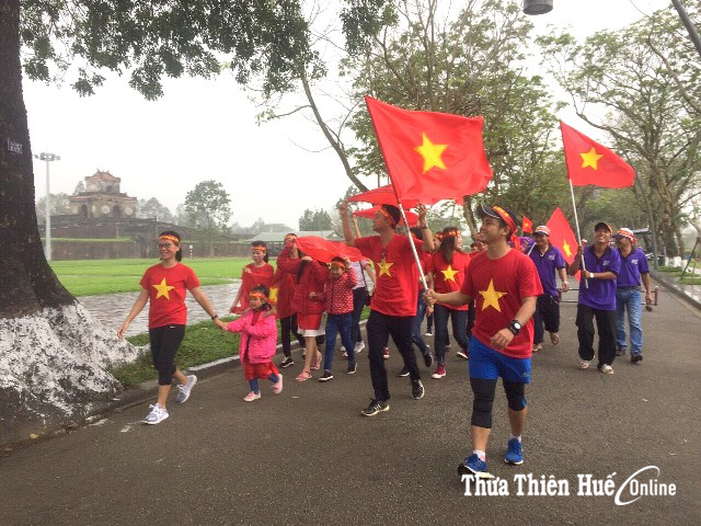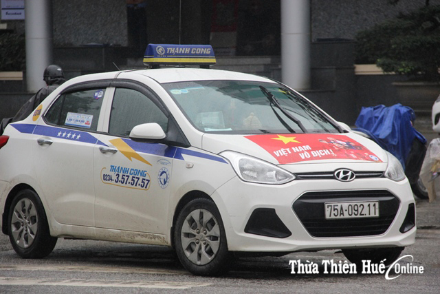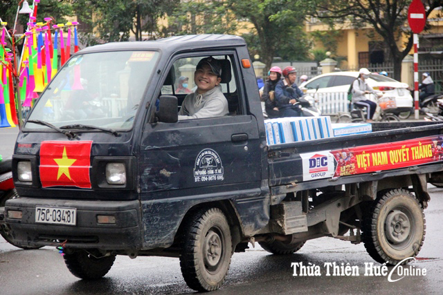 Từng góc phố, tuyến đường tại Cố đô trở nên nổi bật hơn với cờ, bằng rôn, khẩu hiệu cổ vũ cho U23 Việt Nam. Đặc biệt, không ít phương tiện di chuyển trên đường từ ô tô cá nhân, taxi, xe chở hàng hay xe máy cũng dán hình ảnh quốc kỳ kèm những dòng chữ: “Việt Nam vô địch”, “U23 Việt Nam chiến thắng”, “Tiến lên Việt Nam”…