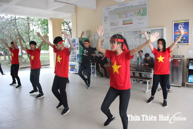 Sinh viên Trường ĐH Khoa học Huế tập luyện nhảy dân vũ để cổ vũ U23 Việt Nam