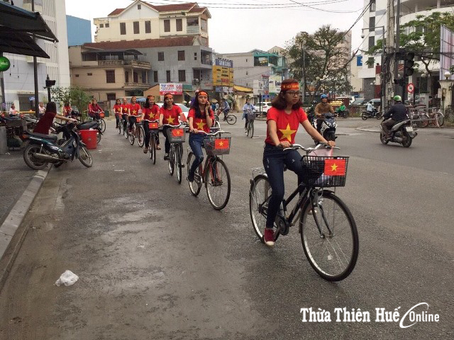 Công ty Du lịch Nụ Cười Huế tổ chức đạo xe diễu hành cổ vũ cho U23 Việt Nam (ảnh: Đức Quang)