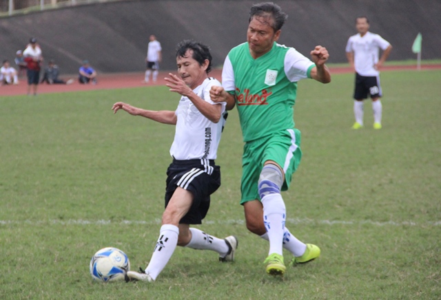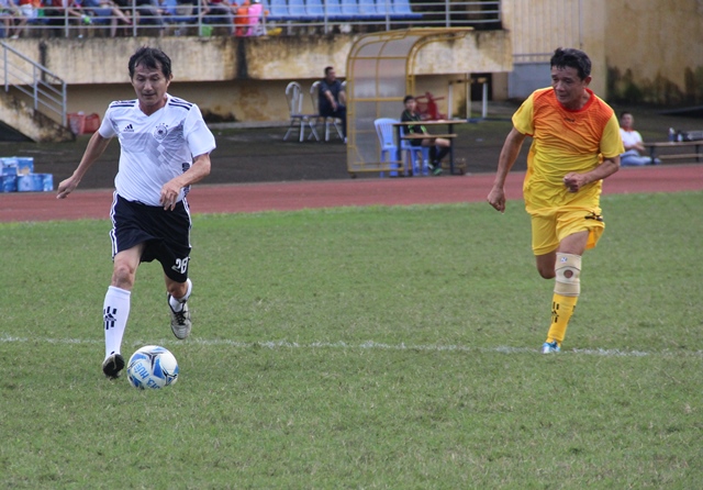 Một pha tranh chấp bóng trong trận đấu giữa CLB Cựu cầu thủ Huế (trắng) và CLB Cựu cầu thủ Sài Gòn