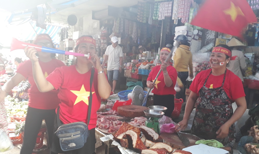 Không khí bóng đá tiếp tục lan tỏa khi nhiều chị em tiểu thương tại chợ An Cựu cũng chuẩn bị áo, cờ, kèn cổ vũ cho U23 Việt Nam. Chị Lan - một tiểu thương bán thịt heo khẳng định: "Đúng 15h30 tui dọn sạp về cổ vũ U23 Việt Nam, thịt còn thì đem về nhà ăn. Buôn bán còn cả đời, lo chi".
