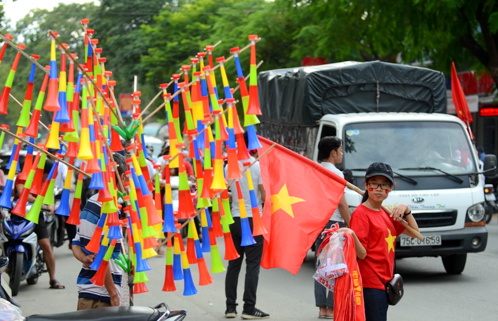 Những "phụ kiện" để cổ vũ cho U23 Việt Nam được bày bán trên nhiều tuyến đường ở Huế