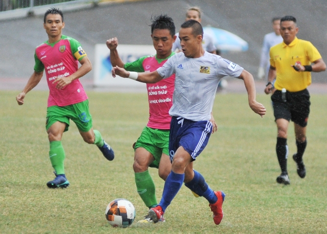 Pha đi bóng của Phi Pha (áo trắng) buộc cầu thủ Đồng Tháp phạm lỗi
