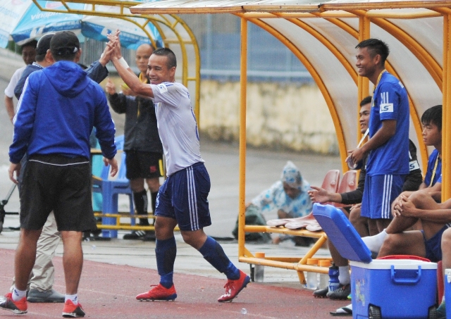Đặng Văn Phi Pha ăn mừng cùng đồng đội và BHL trong khu vực kỹ thuật sau bàn thắng đẹp mắt