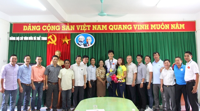 Lãnh đạo các bộ môn thể thao chụp hình lưu niệm cùng VĐV Lê Minh Thuận và Trần Thị Yến Hoa