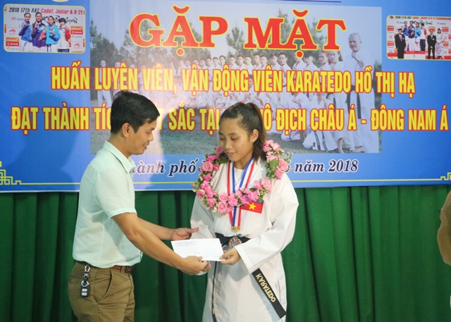 HNN.VN - Chiều 15/5, Trường trung cấp Thể dục Thể thao Huế và bộ môn Karatedo tỉnh tổ chức đón, gặp mặt và chúc mừng vận động viên (VĐV) Hồ Thị Hạ trở về Huế sau khi thi đấu thành công hai giải đấu của khu vực và châu lục.