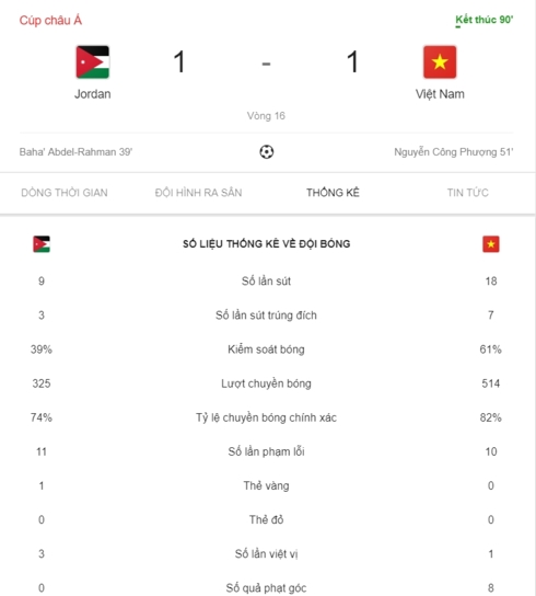 Theo thống kê khi kết thúc hiệp 2, ĐT Việt Nam vượt trội ĐT Jordan ở tỷ lệ kiểm soát bóng (61% so với 39%), số lần dứt điểm (18 so với 9), số lần dứt điểm trúng đích (7 so với 3), số lần phạt góc (8 so với 0), số đường chuyền (541 so với 325).