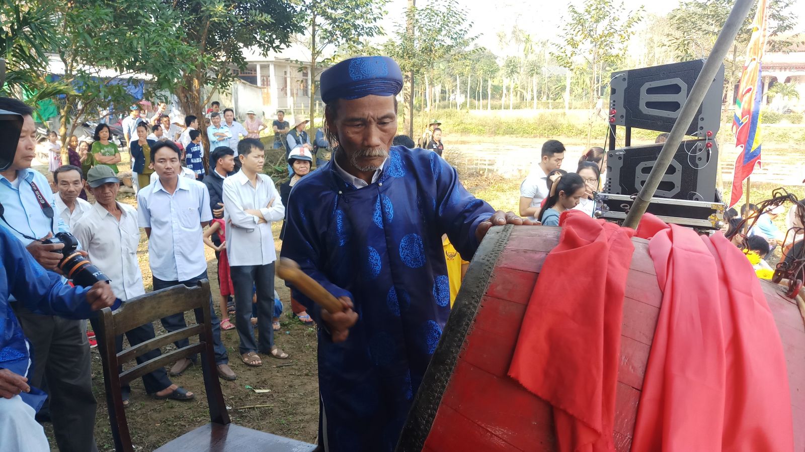 Một vị cao niên làng Gia Viên đánh 3 hồi trống khai mạc Hội đu