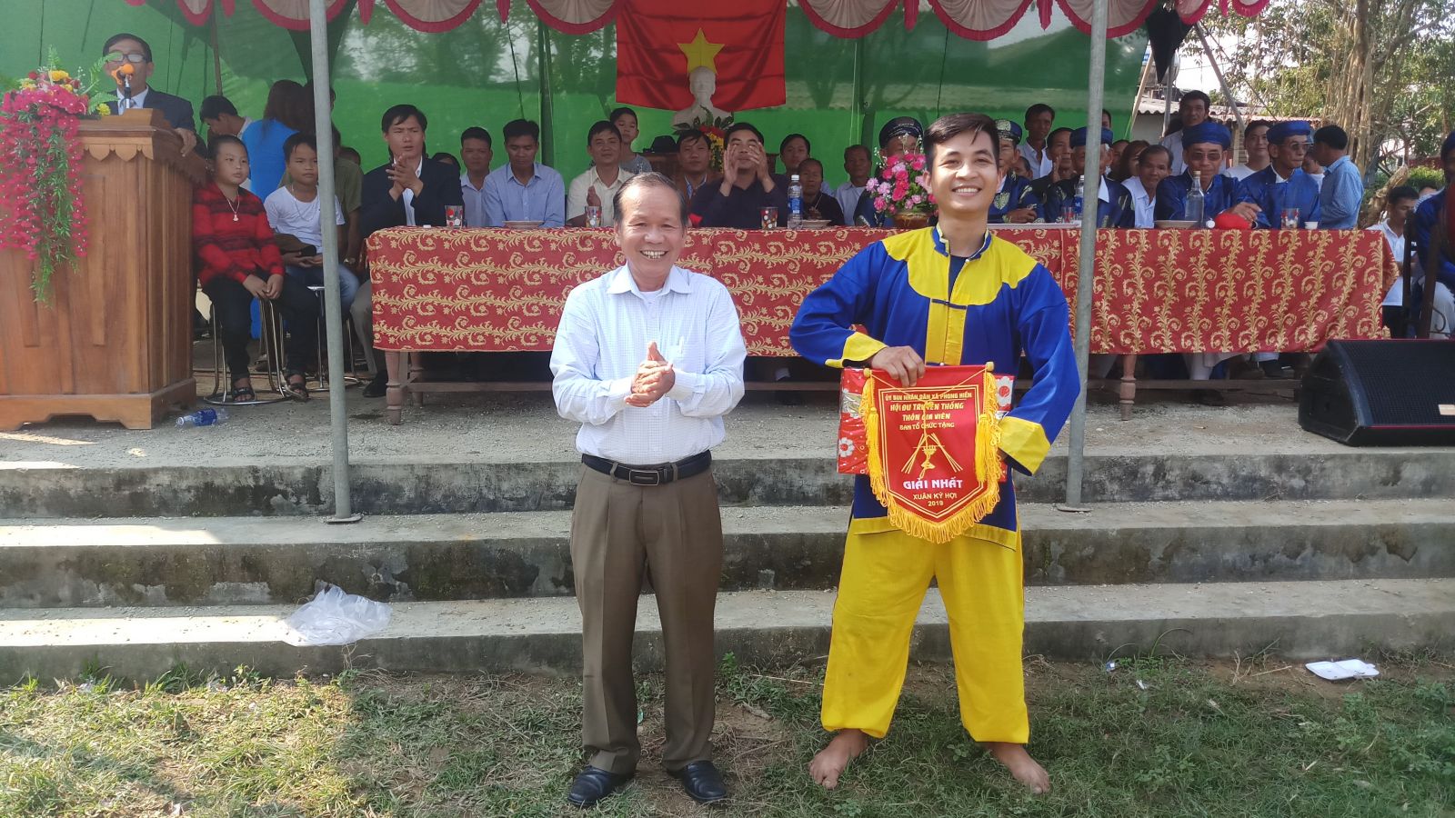 Trưởng Ban tổ chức Huyện ủy Phong Điền - Hoàng Văn Kỳ trao giải cho Trương Thế Sỹ, người vừa đạt giải Nhất và giải phá của Hội đu