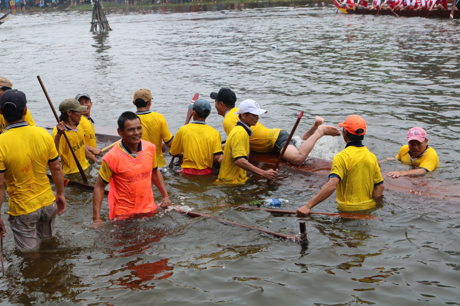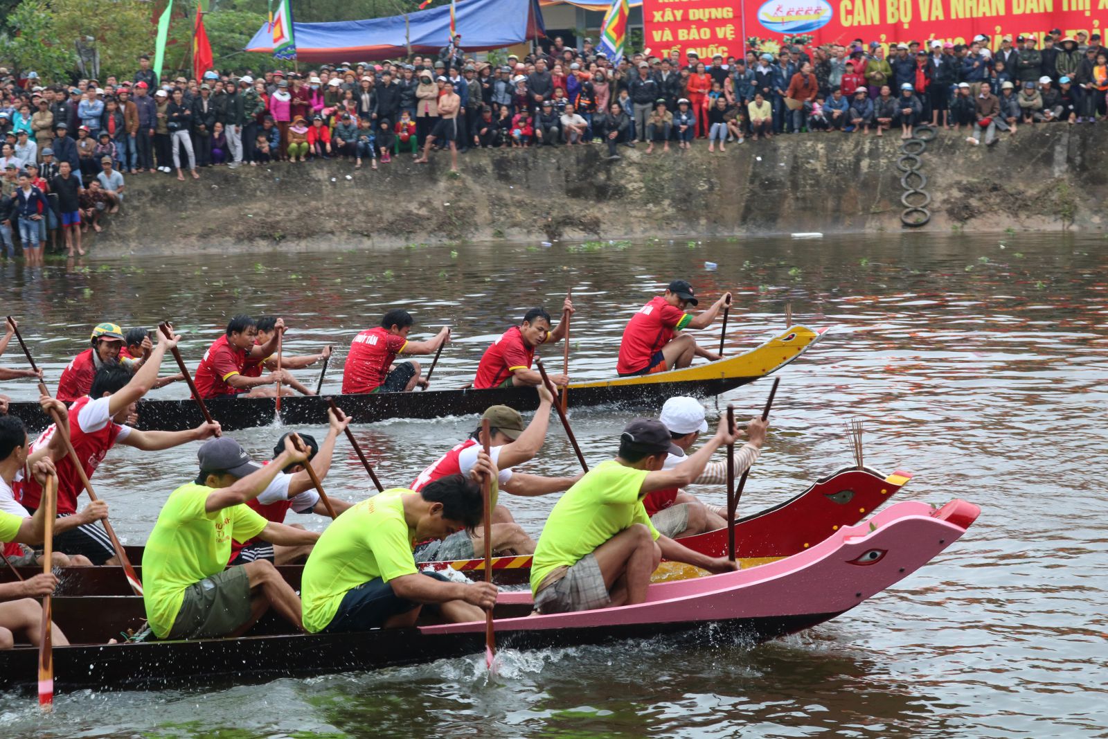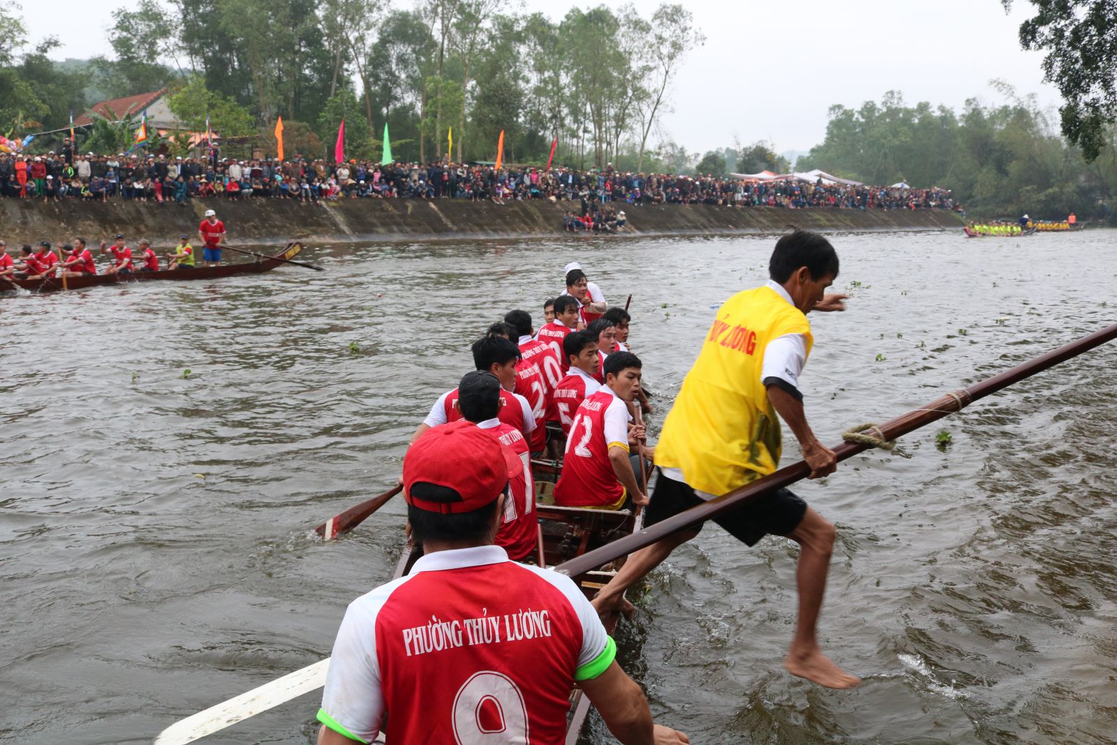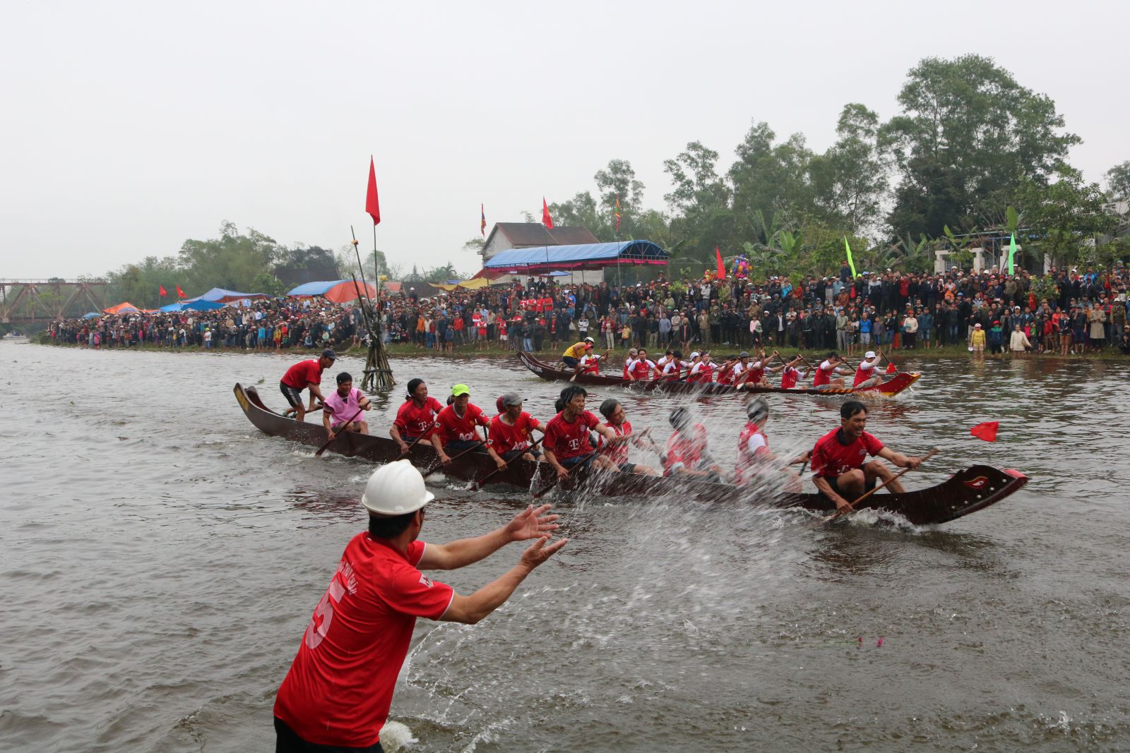 HNN.VN - Từ khi hội đua chưa bắt đầu, người dân gần xa đã nối chân các bạn đua tập trung càng lúc càng đông về cổ vũ. Cả một quãng sông sôi động trong tiếng hò reo rộn rã, át cả tiếng phèng la, trống hội thúc giục.