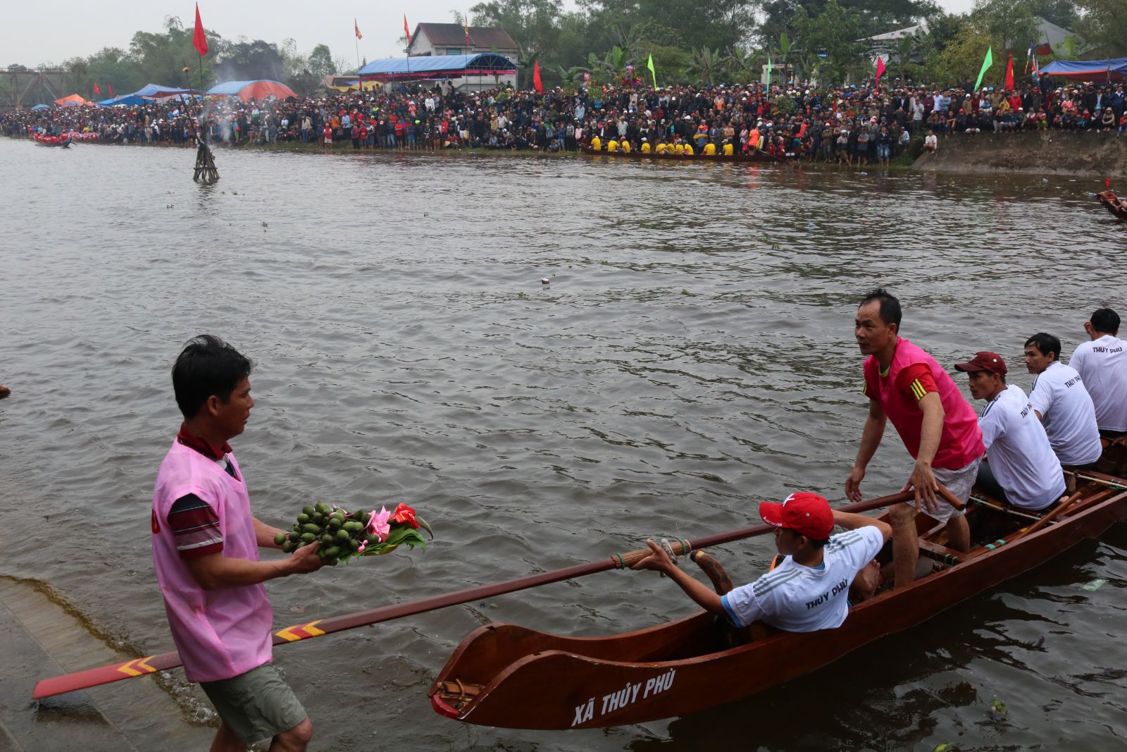 Từ khi hội đua chưa bắt đầu, người dân gần xa đã nối chân các bạn đua tập trung càng lúc càng đông về cổ vũ. Từ độ cúng, các độ tiền đến độ phá, cả một quãng sông sôi động trong tiếng hò reo rộn rã, át cả tiếng phèng la, trống hội thúc giục. Ông Ngô Thả, đến từ xã Thủy Phù phấn khởi: "Chúng tôi đi làm ăn xa nhưng ngày xuân vẫn cố nán lại thêm ít ngày để vui hội đua trải. Chúng tôi cổ vũ vô tư cho tất cả các đội. Đây đúng là một ngày hội thực sự".