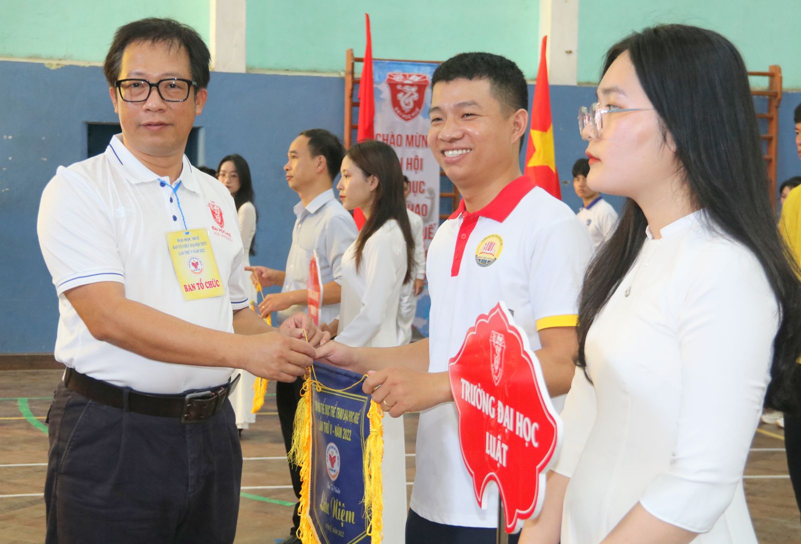PGS.TS. Lê Anh Phương, Giám đốc ĐH Huế tặng cờ lưu niệm cho các đơn vị tham gia Đại hội TDTT