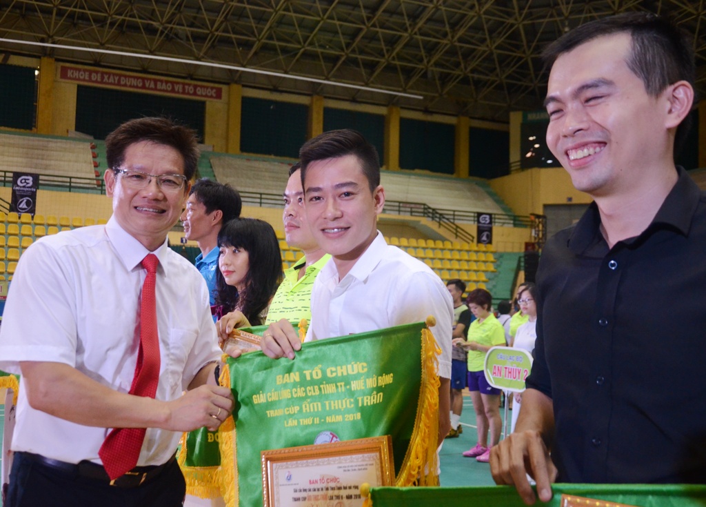 Chủ tịch LĐ cầu lông tỉnh - Phan Thanh Hải trao cờ lưu niệm cho các nhà tài trợ