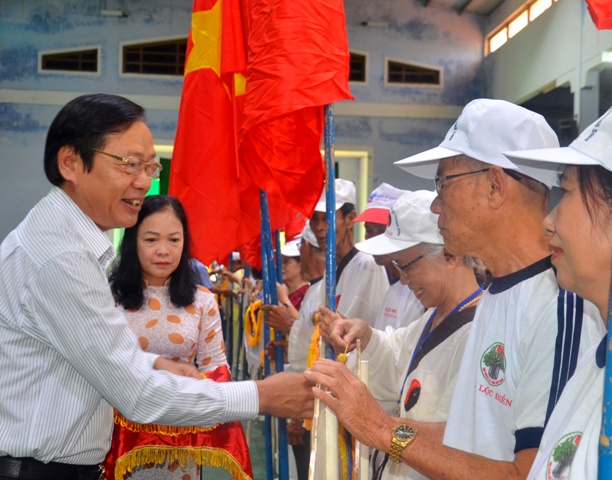 Bí thư Thành ủy Huỳnh Cư tặng cờ, động viên các cụ tham dự hội thao