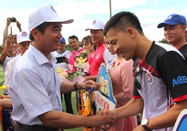 Phó Bí thư Thường trực Tỉnh ủy Bùi Thanh Hà trao cờ lưu niệm cho các đội bóng