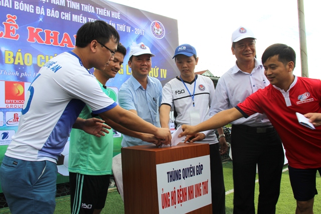 Tại lễ khai mạc cũng diễn ra hoạt động quyên góp ủng hộ bệnh nhi ung thư đang điều trị tại bệnh viện Trường Đại học Y Dược Huế. Hoạt động này thu hút tất cả cầu thủ và nhiều cổ động viên các đội hưởng ứng. Anh Trần Đại, cầu thủ CLB Bóng đá Báo chí Thanh Hóa chia sẻ: “Giải không chỉ sân chơi rất bổ ích, lành mạnh cho những người làm làm báo mà còn là cơ hội để những người cầm bút phát huy tinh thần tương thân, tương ái. Đội chúng tôi ai cũng đóng góp và rất phấn khởi khi được tham gia hoạt động hỗ trợ bệnh nhi ung thư. Việc gắn thể thao với hoạt động giàu tính nhân văn này cũng là mong muốn của rất nhiều nhà báo”.
