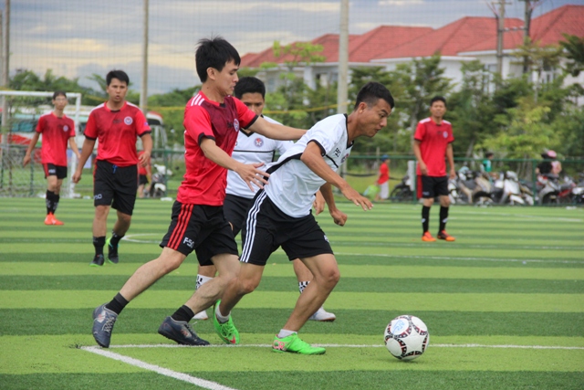 Một pha tranh bóng trong trận đấu giữa Liên quân Báo chí Đài Phát thanh Truyền hình tỉnh & Báo Thừa Thiên Huế gặp CLB Bóng đá Báo Chí Thường trú Huế