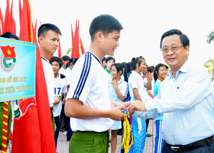Ông Trần Thanh Bình – Phó Bí thư Thường trực Tỉnh ủy tặng hoa cho các đoàn tham dự