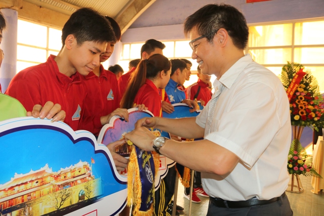 Ông Phan Thanh Hải, Giám đốc Sở Văn hóa và Thể thao trao cờ lưu niệm cho các đoàn VĐV tại lễ khai mạc giải