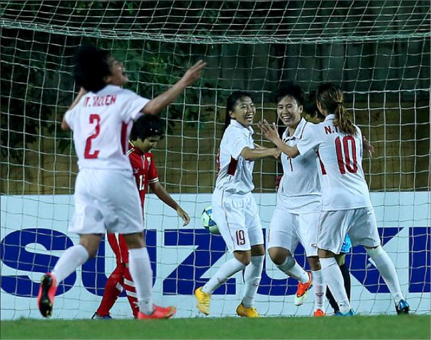 Pha ăn mừng của các nữ cầu thủ Việt Nam sau pha ghi bàn vào lưới Myanmar. Ảnh: Internet