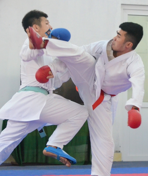 Huế (giáp xanh) giành HCV sau khi đánh bại Quảng Nam ở nội dung kumite đồng đội nam lứa tuổi trên 18