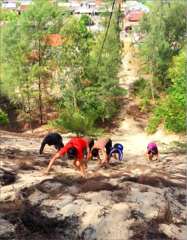 Bắt đầu bằng bài kiểm tra tốc độ trên cát, trong 1 ngày, các VĐV nam, lẫn nữ phải vượt qua chặng đường 5-10km. Với người bình thường, chạy trên cát chắc chắn không là điều đơn giản, bởi cát mềm, lún, tốn sức hơn chạy trên đường nhựa, đường đất. Tuy nhiên, với các VĐV đây chưa phải bài tập nặng nhất, bởi sang ngày thứ 2, cuộc chinh phục bằng cách thi chạy qua 2 con dốc: “Mạ ơi” và “Thượng đế cũng phải khóc” (mỗi dốc chỉ dài chừng 70-100m nhưng có độ cao... khó tả) mới thật sự “kinh hoàng”, mới cảm nhận được phần nào gian khổ của các VĐV Taekwondo Huế trong hành trình đem vinh quang về cho tỉnh nhà.