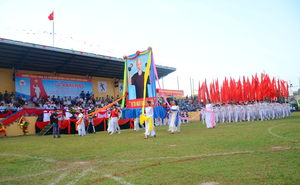 HNN.VN - Đại hội Thể dục thể thao (ĐH TDTT) TP. Huế khai mạc chiều 14/4 tại Trung tâm TDTT TP. Huế, các ông: Nguyễn Thái Sơn – UVTV – Trưởng Ban Tuyên giáo Tỉnh uỷ; Nguyễn Dung – Phó Chủ tịch UBND tỉnh; lãnh đạo thành phố và ngành thể thao cùng 1.500 VĐV, quần chúng đến từ 31 đơn vị trên địa bàn thành phố đã đến dự.