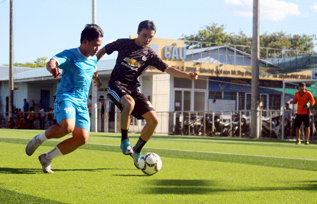Sau lễ khai mạc, các trận đấu diễn ra sôi động (Ảnh: Pha tranh bóng giữa cầu thủ Khách sạn Mường Thanh (áo đen) và Khách sạn Eldora)